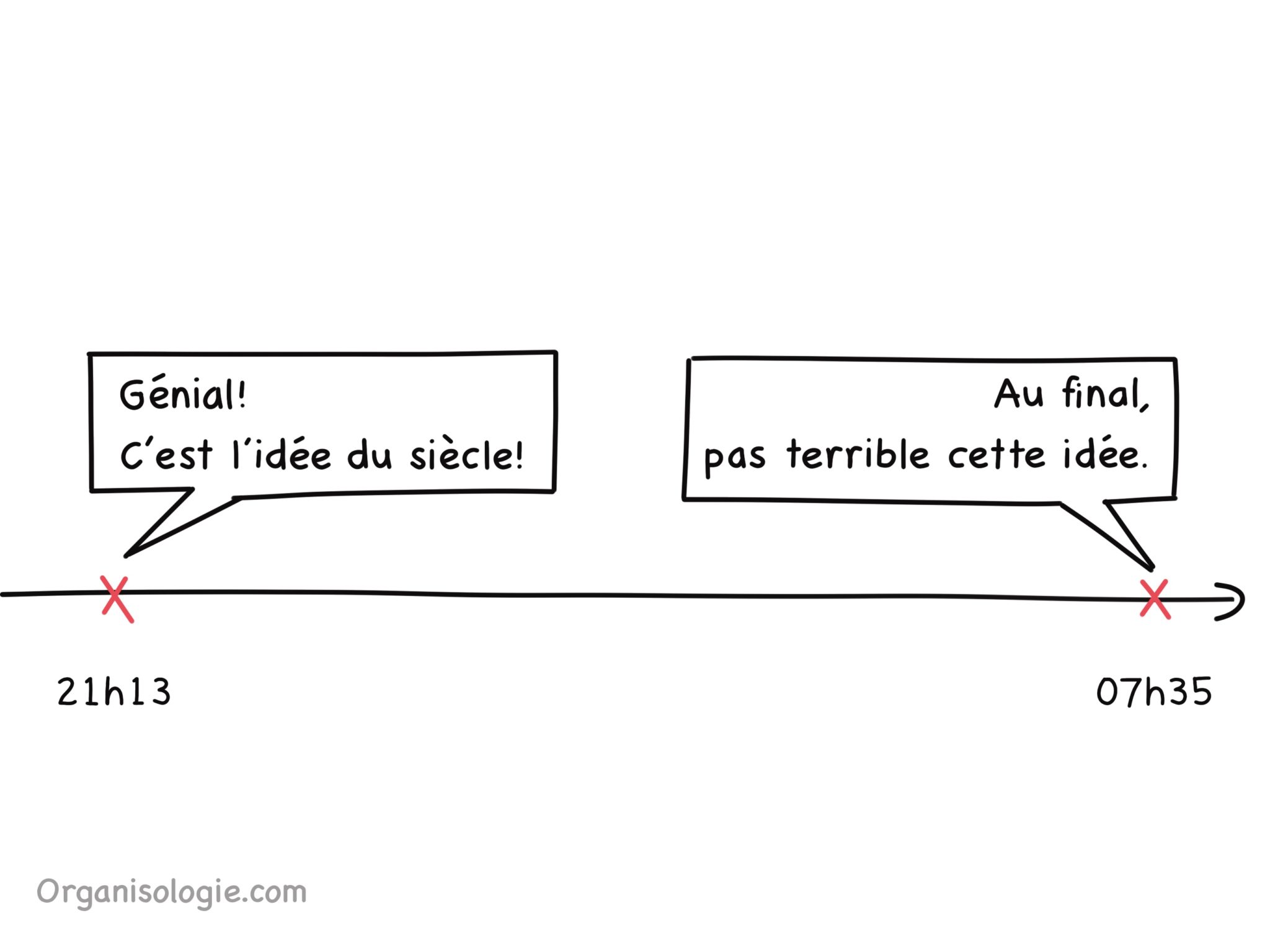 L'enthousiasme généré par cette idée initiale peut être étouffé si on se met à créer des plans d'action. On se projette et on se met à voir ce qui pourrait ne pas fonctionner, les risques, les lacunes dans la manière idéale de parvenir à nos fins, et après une ou deux nuits de sommeils, cette idée qui semblait si prometteuse n'est plus que l'ombre d'elle-même.