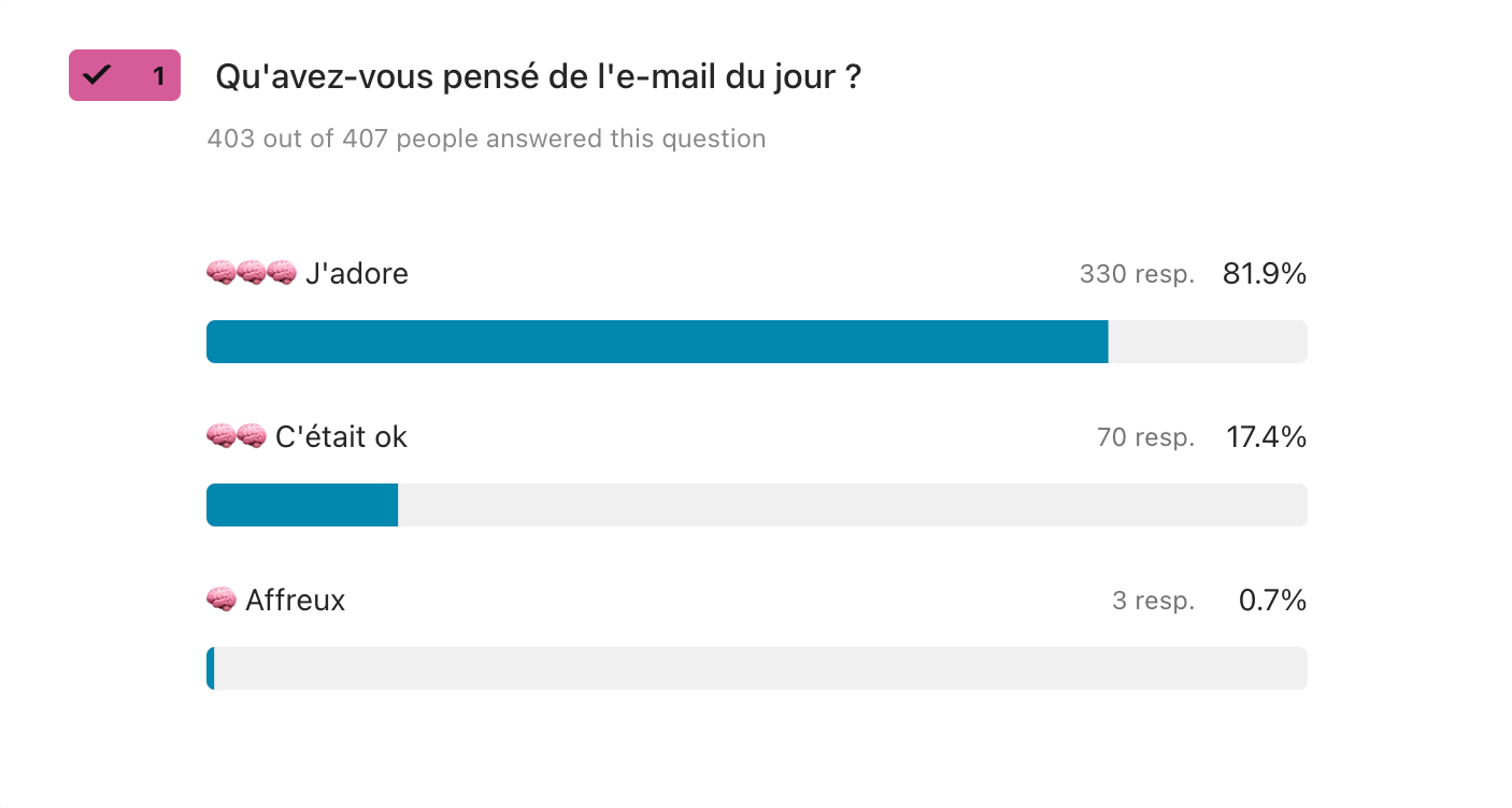 Je mesure depuis quelques mois si mes e-mails du lundi (ON) sont top, bof, ou affreux. C'est biaisé évidemment, vu que les gens qui ne les lisent pas, vont pas prendre le temps de voter. Mais ça donne une tendance.