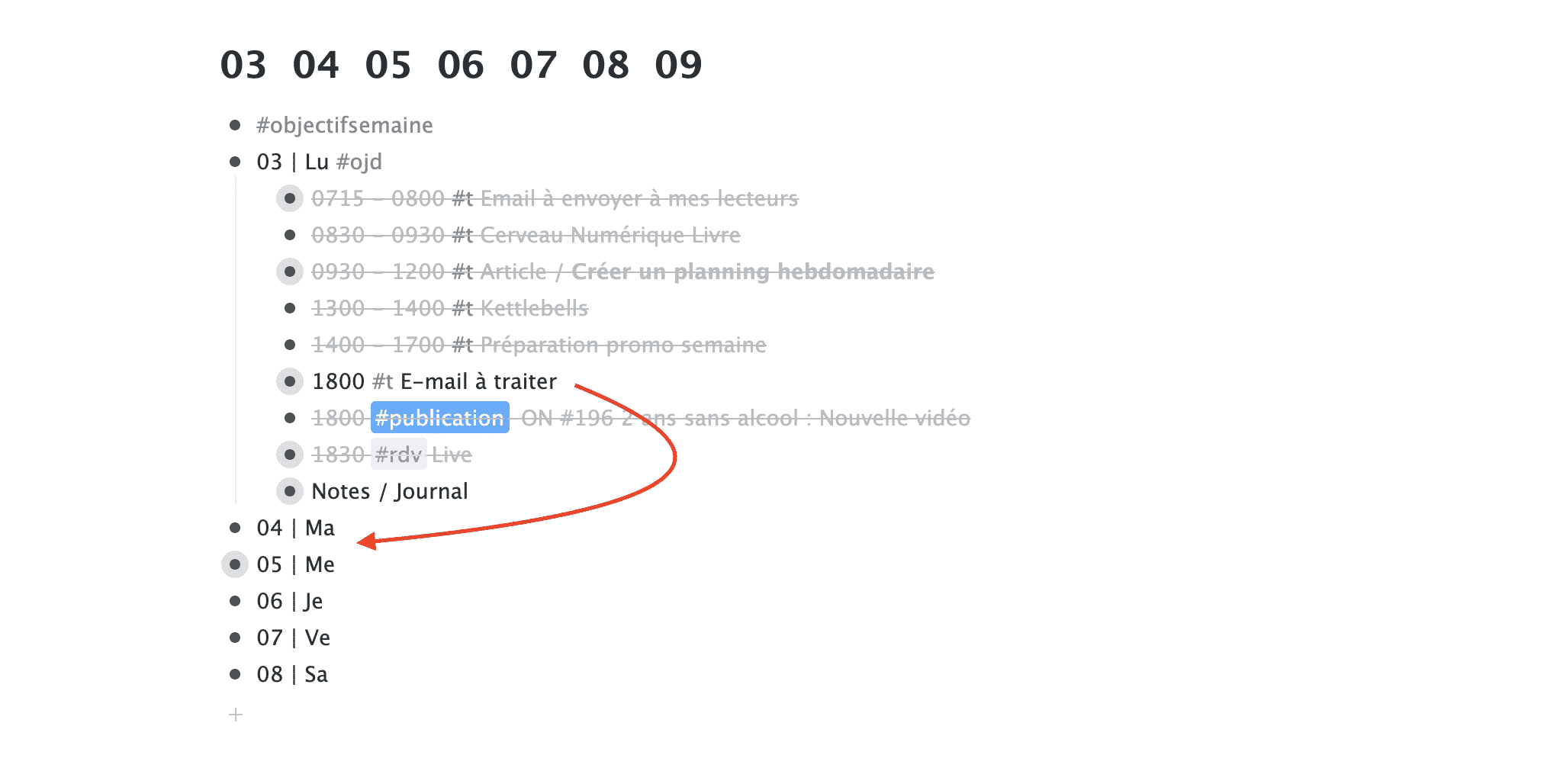 À la fin du jour, je déplace au lendemain les actions que je n'ai pas réalisées.