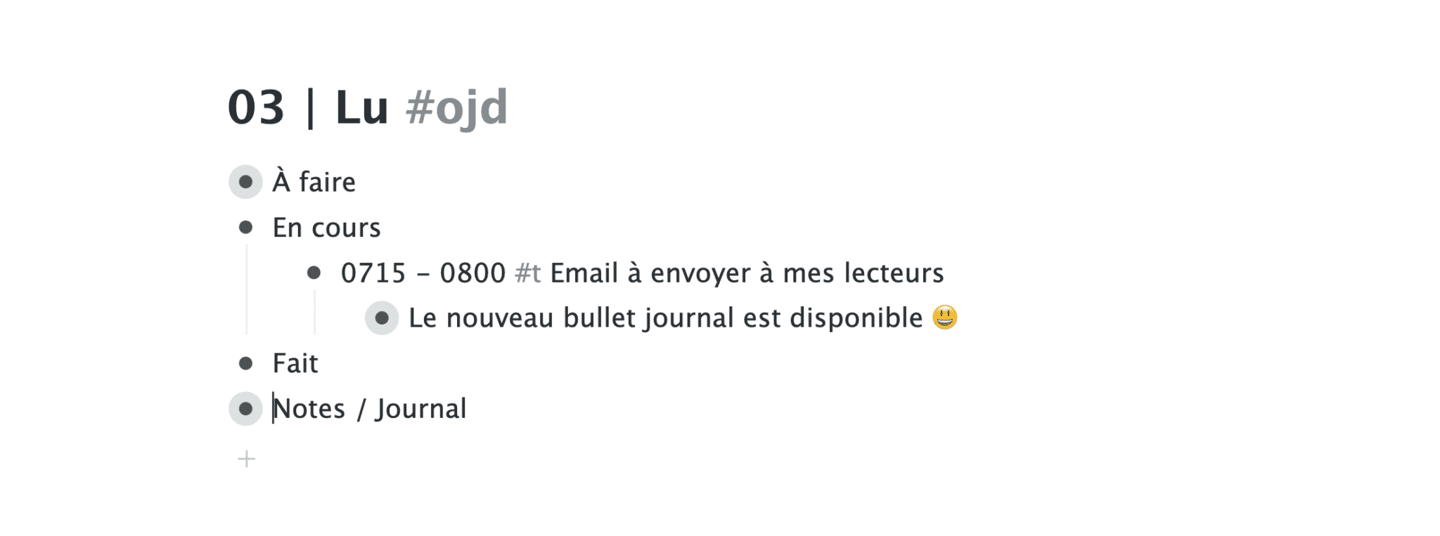 Je pense que beaucoup d'utilisateurs du bujo apprécieront l'application Workflowy. Ainsi, j'ai décidé d'utiliser la puissance des outils numériques et adapter le bullet journal pour en faire un bullet journal numérique.