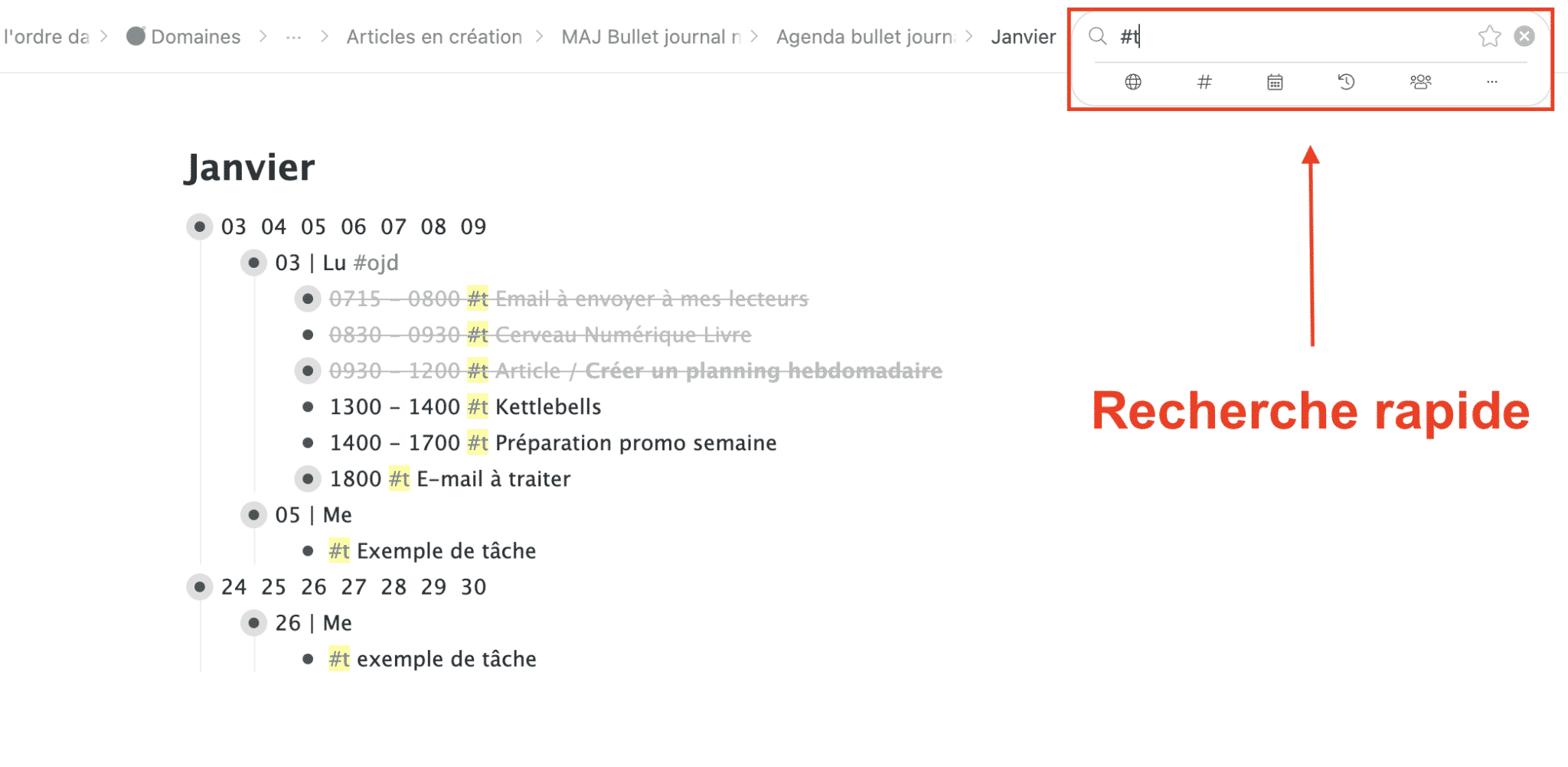 Passer d'une page à l'autre. Ressaisir l'information (point fréquent lorsqu'il s'agit d'organisation sur carnet papier). Retrouver facilement un rendez-vous. Avec le bullet journal numérique, c'est du passé.