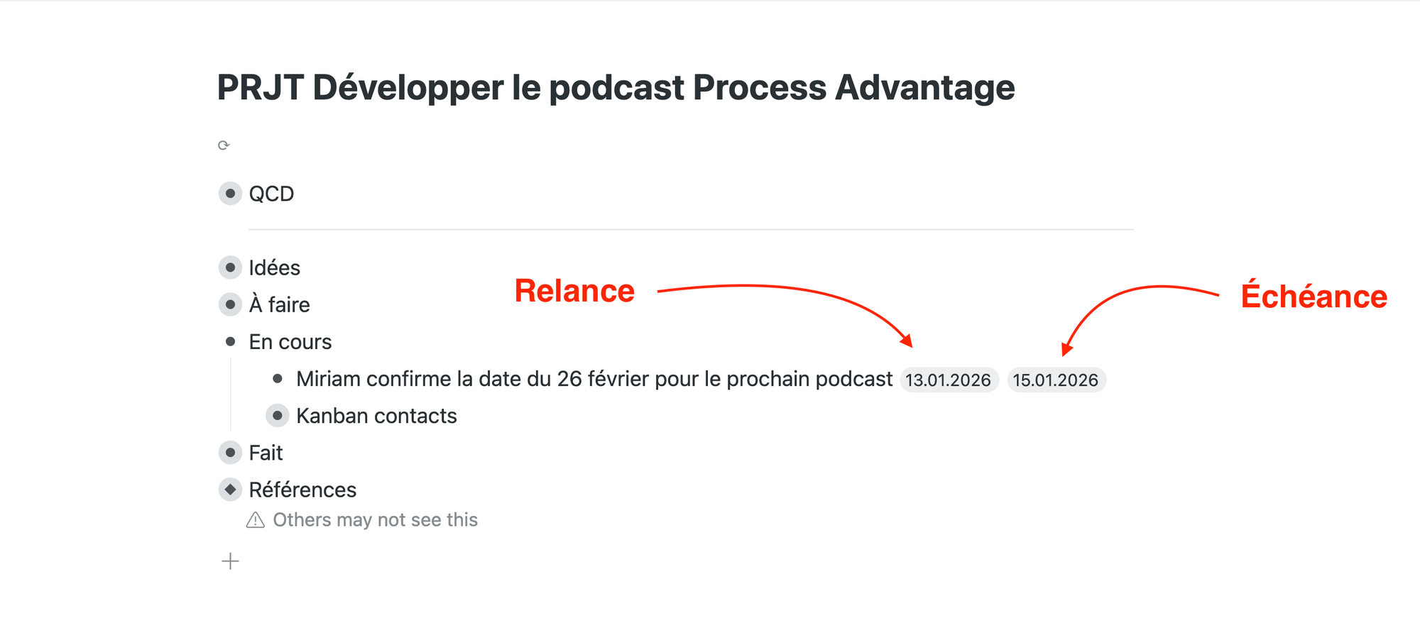 - La date de relance pour voir si le responsable de la tâche avance comme prévu.