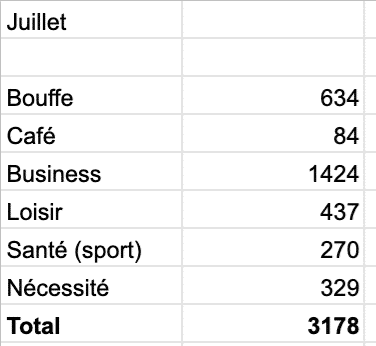 Voici un tableau récapitulatif (j'ai viré les charges fixes, assurances, loyer, etc.).