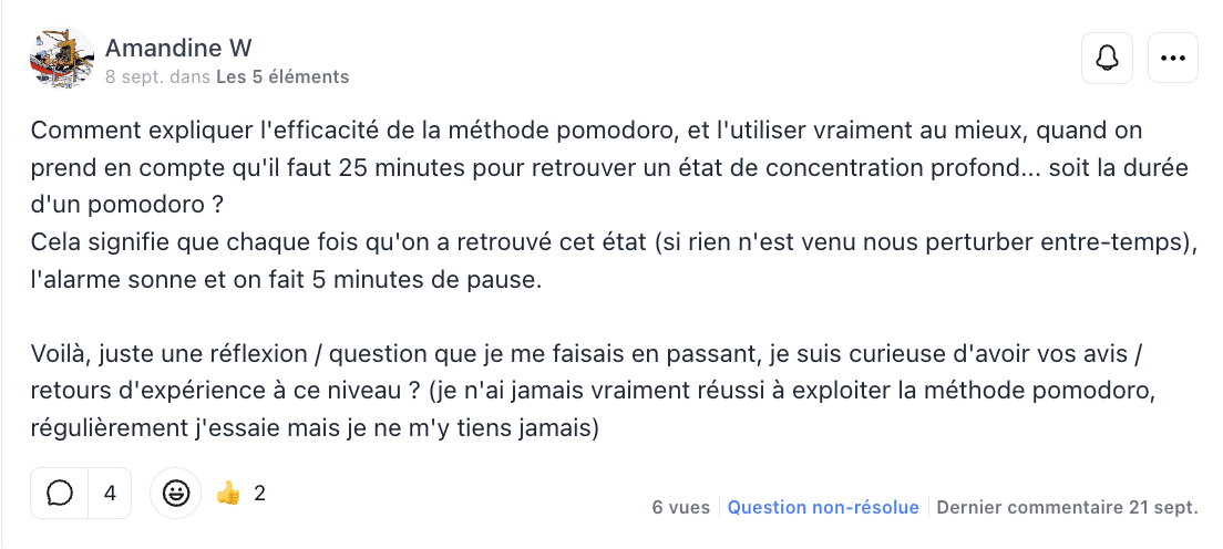 Vous l'avez compris, la méthode pomodoro s'appuie sur la loi de Parkinson mais également sur le petit secret que Fransceco m'a expliqué de vive voix lors d'un appel en novembre 2021 :
