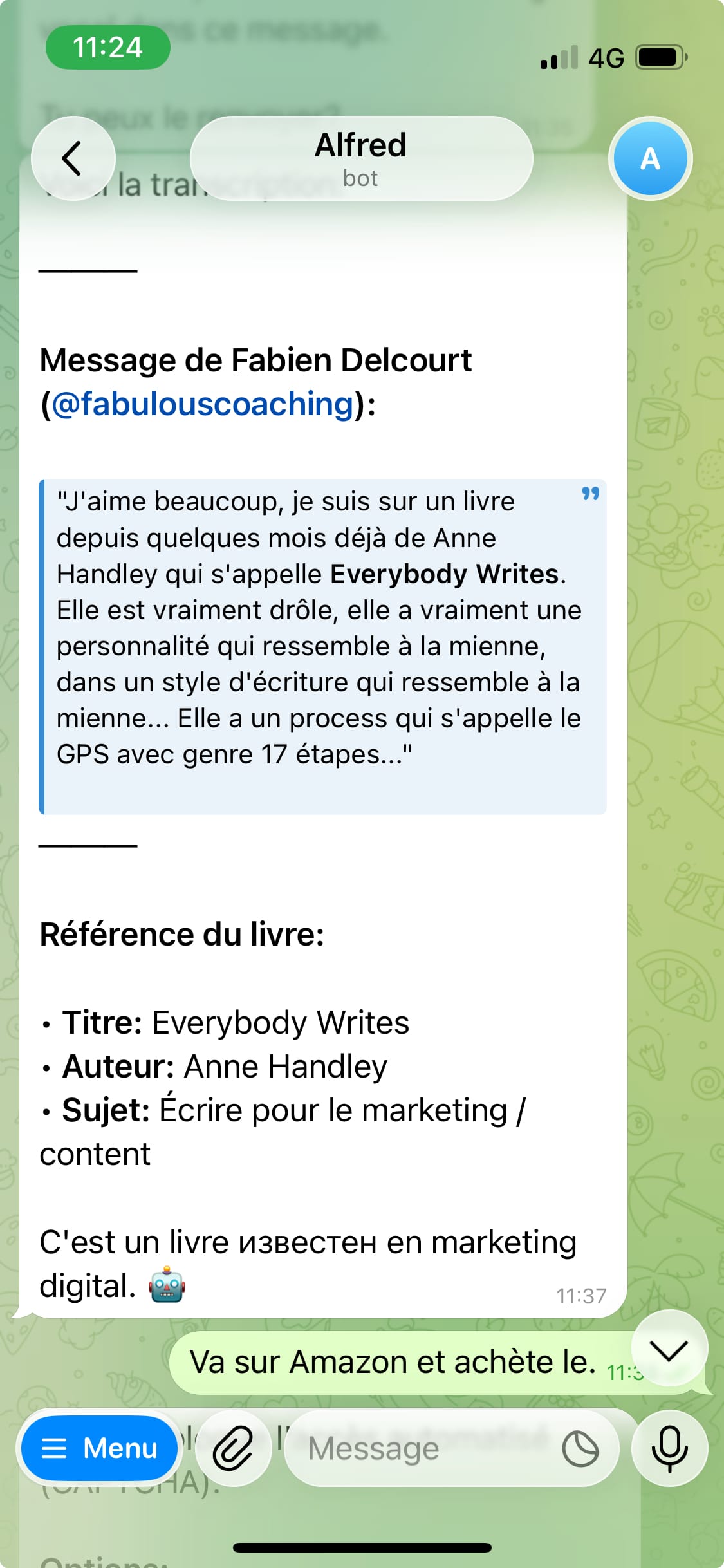 Si je discute avec un ami et que c'est top, je peux transmettre à Alfred, qui m'extrait des pépites. Je peux ensuite lui demander de poster... OU de relire, ou d'acheter.