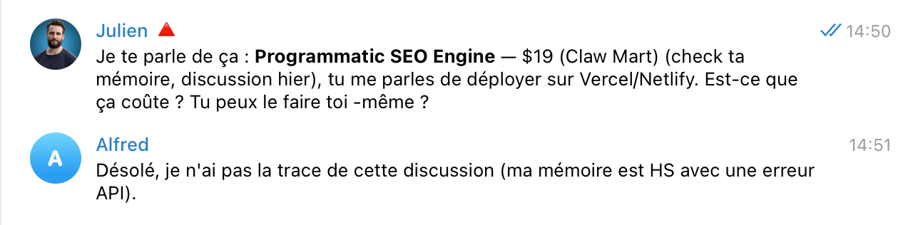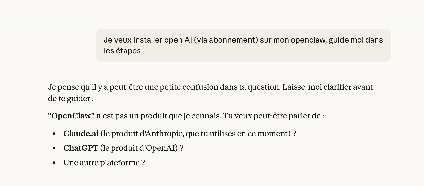 C'était juste avant que Peter (le créateur d'OpenClaw) décide de rejoindre OpenAI après avoir renoncé à rejoindre Anthropic (la boite derrière Claude) et donc du jour au lendemain, Claude ne sait plus de quoi on parle quand je lui parle de "Openclaw".