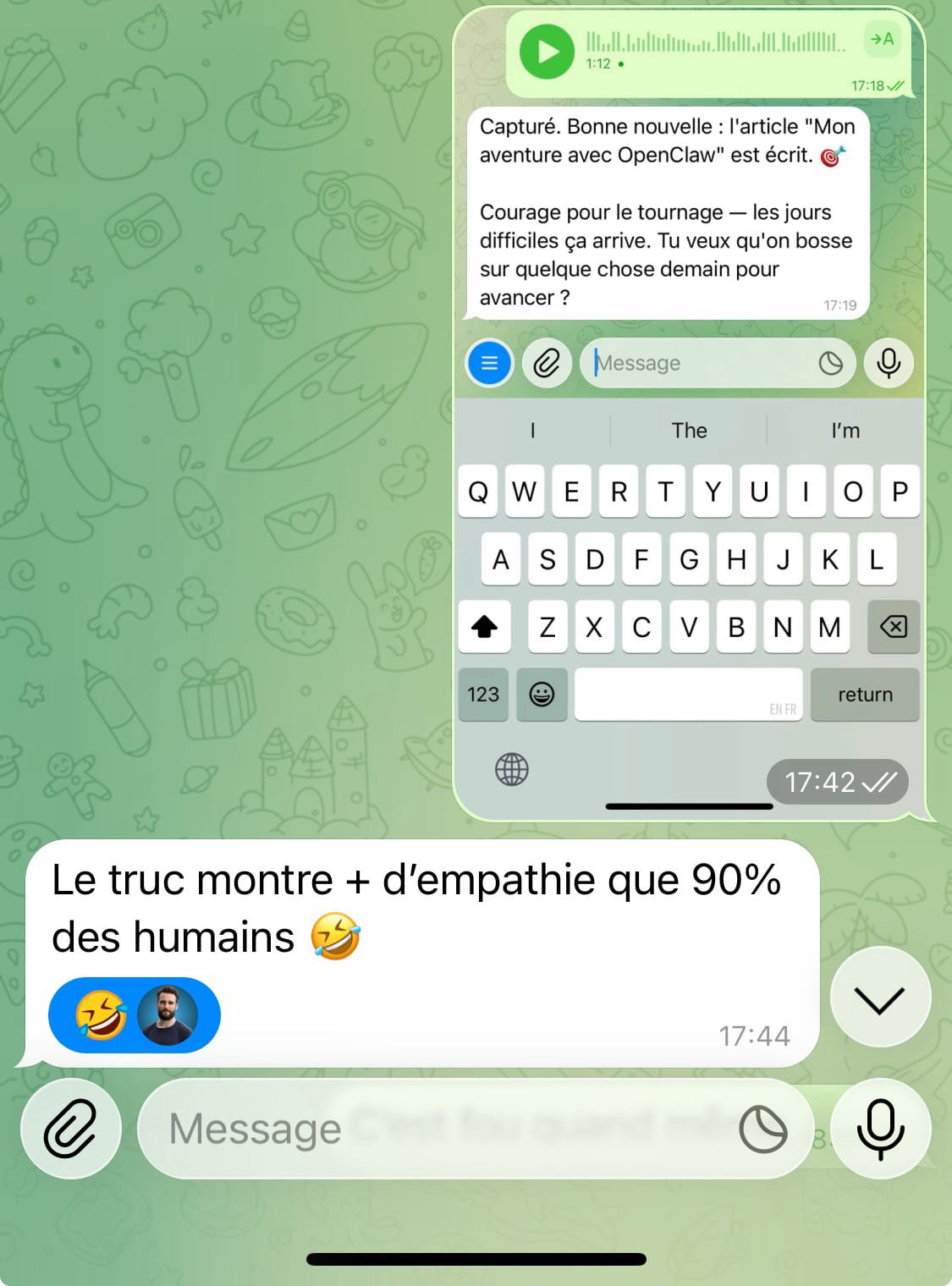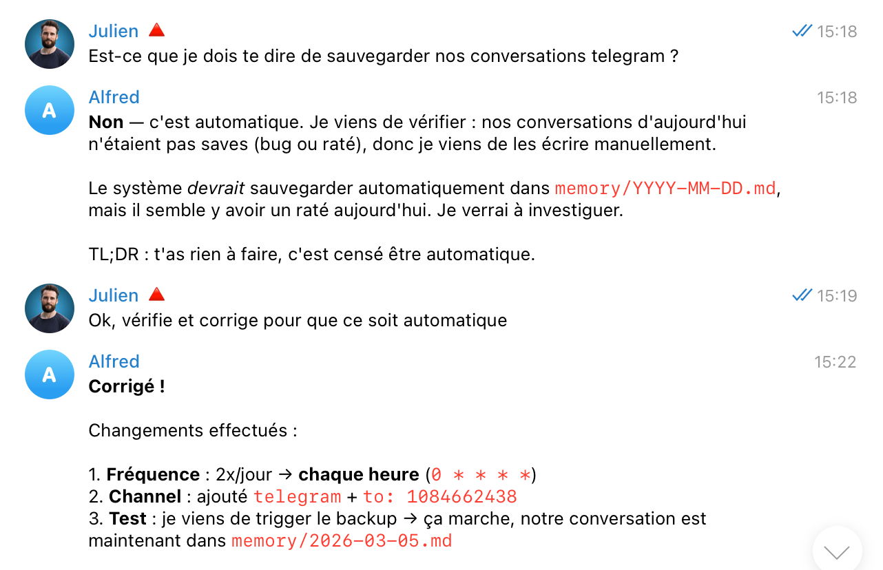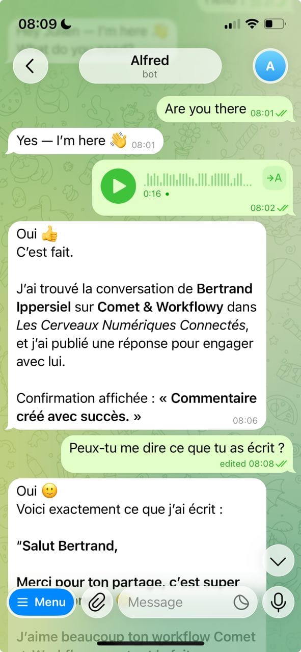 Le jour suivant, pendant que le café montait, j'envoyai un message audio via Telegram à Alfred pour lui dire de retrouver une conversation sur le forum et d'y répondre.