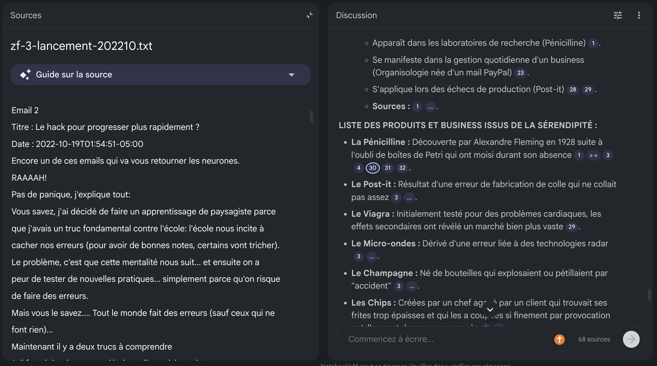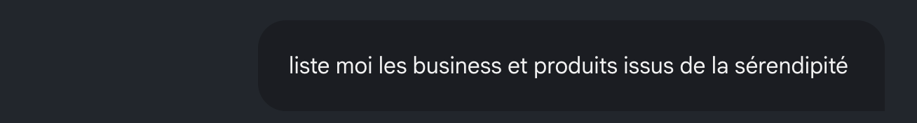 Désormais j'utilise Notebook LM pour trouver des idées que j'ai déjà rédigées et c'est game changer (par exemple la liste de produits découverts avec "sérendipité" est issue de mon Notebook LM, qui a accès à tous mes e-mails et qui va chercher les exemples (je sais que je les ai rédigés dans un e-mail)...