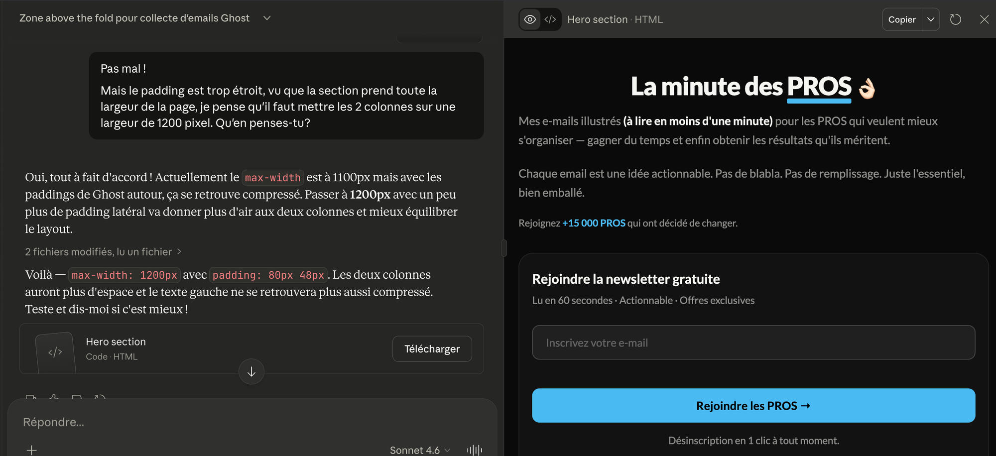 Par exemple, l'amélioration de la page la minute des PROS, a été possible en très peu de temps avec l'aide de Claude (sous ma supervision... ou inversément, je ne sais plus vraiment).