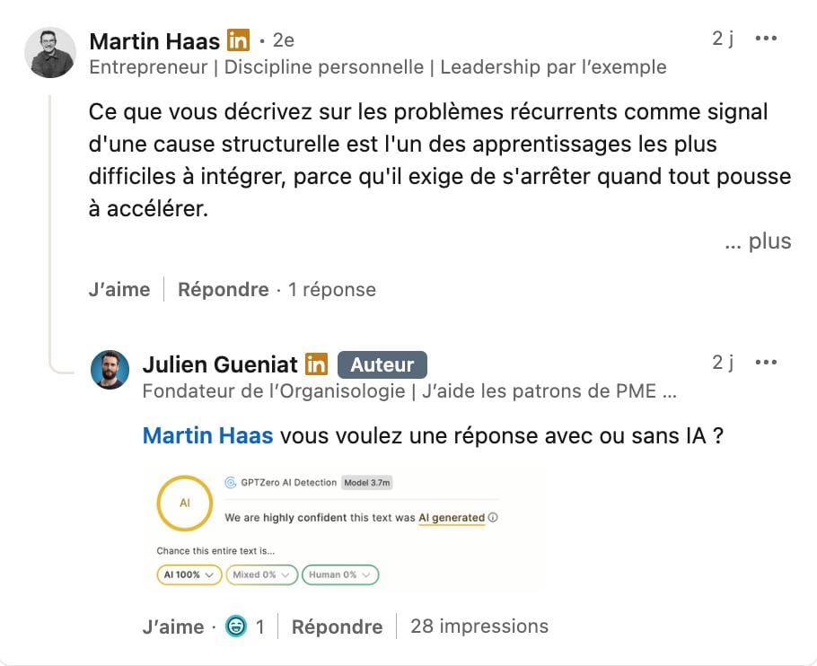 Évidemment, je ne vais pas déléguer mes interactions que j'ai avec des humains, à des machines. C'est le dernier truc à déléguer à mon avis...