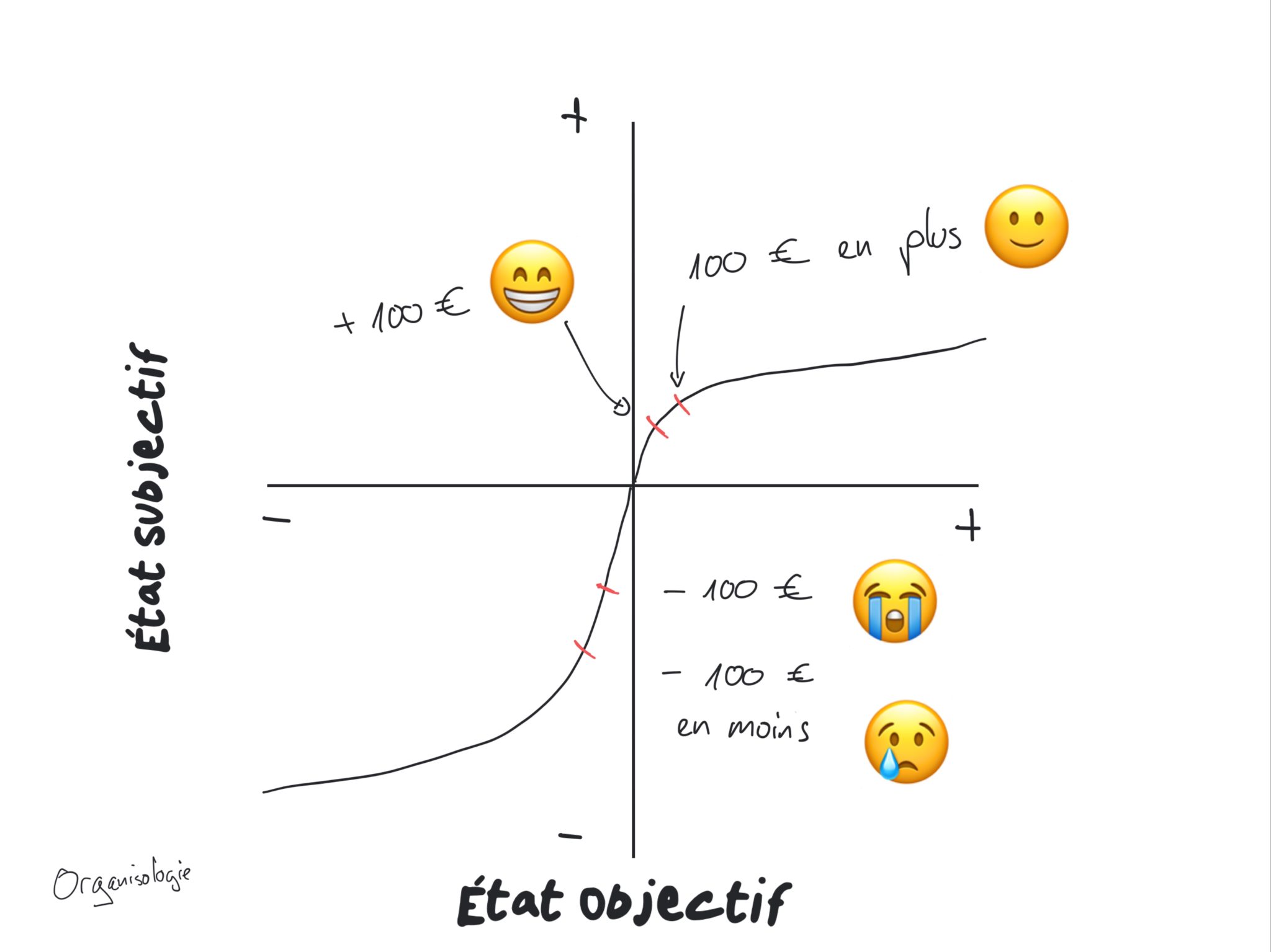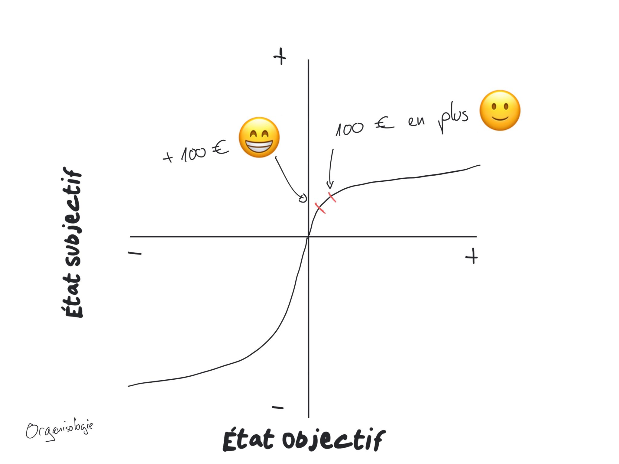 Pour comprendre ce graphe, commençons par observer la case supérieure droite: la courbe monte très rapidement puis s'aplatit. Ainsi, gagner 100 euros provoque un plaisir subjectif de 10 unités. Mais gagner 100 euros supplémentaires provoque peut-être un plaisir subjectif de 8 unités.