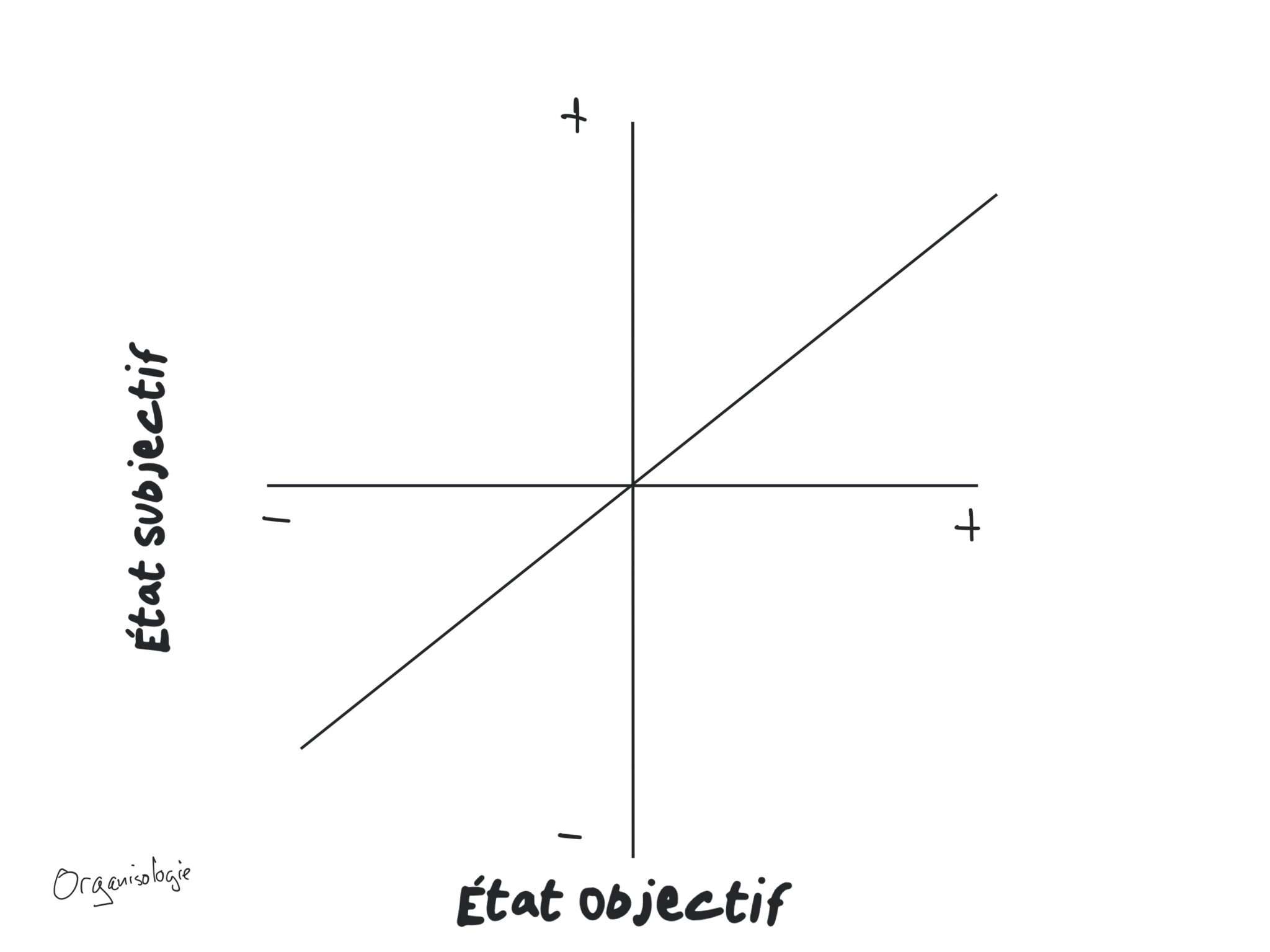 L'axe vertical (l'axe subjectif ou psychologique) représente l'état dans lequel se sentent les gens après une décision. En haut, le signe +, représente un état positif, en bas, le signe -, représente un état négatif.