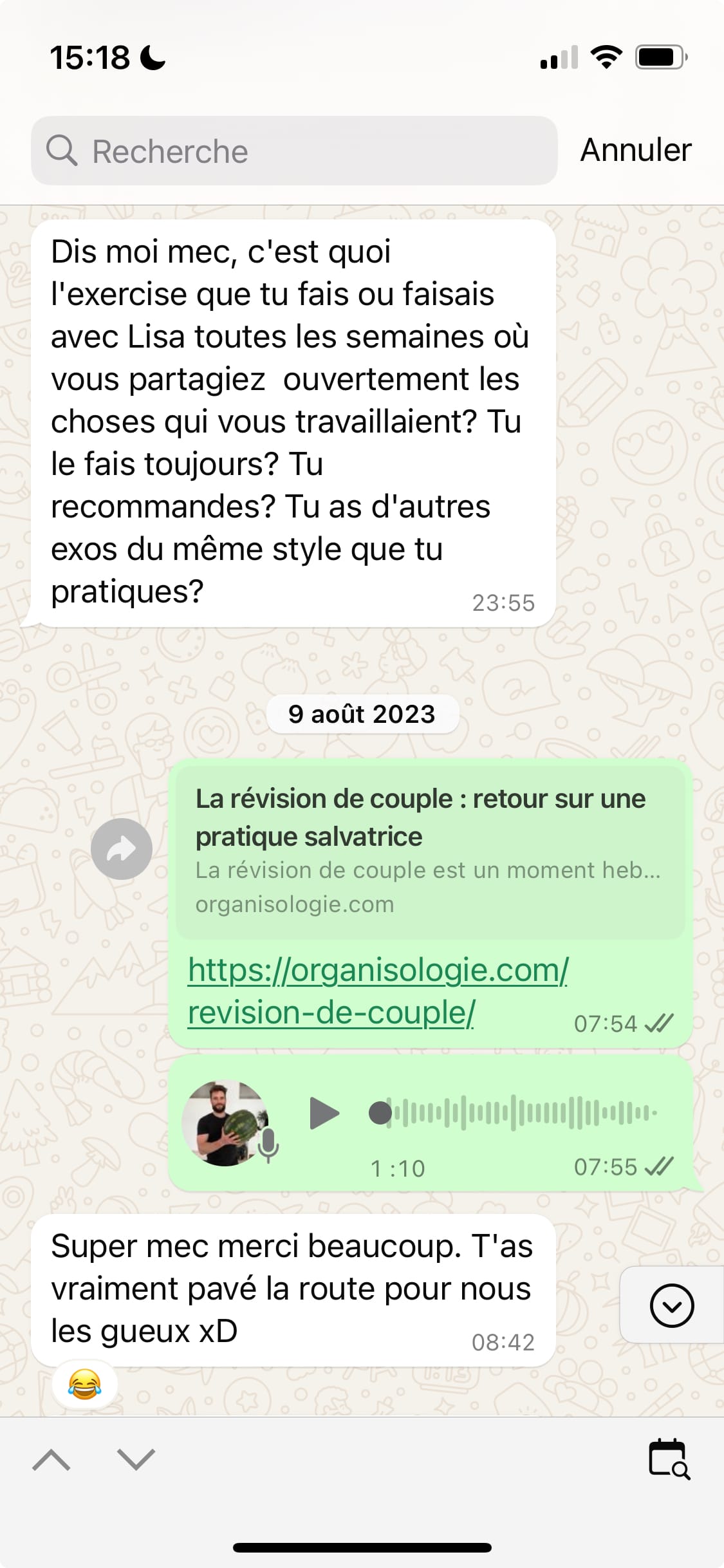La révision de couple que j’effectue chaque semaine de manière irrégulière (il ne faut pas croire, certaines semaines, cette révision passe à la trappe), m’aide à obtenir le résultat suivant : maintenir la communication ouverte et progresser ensemble.
